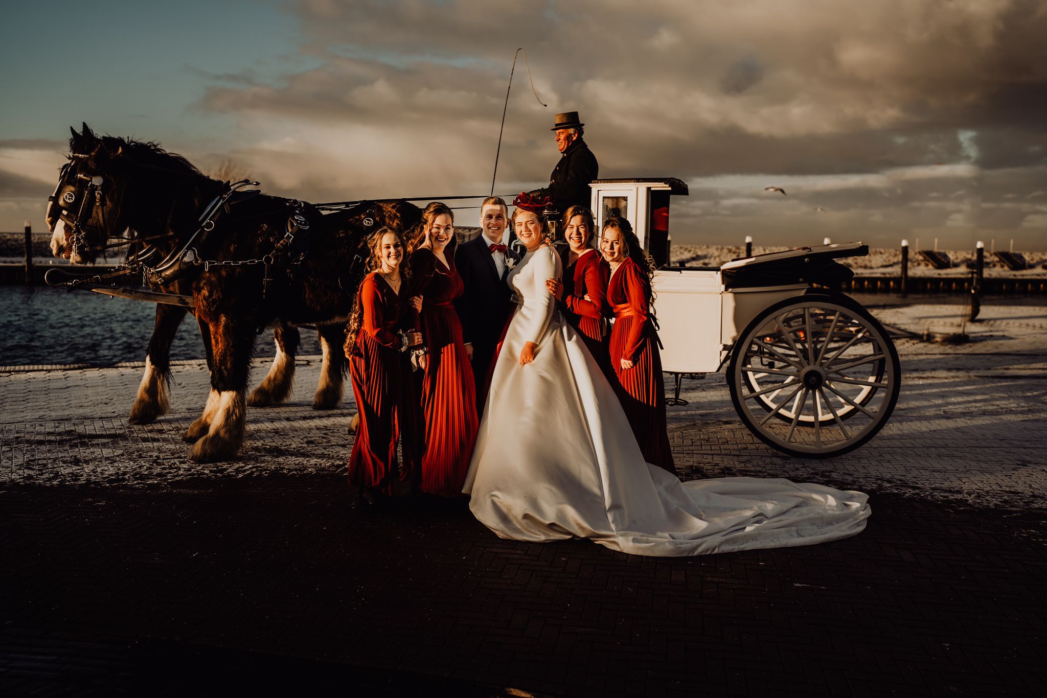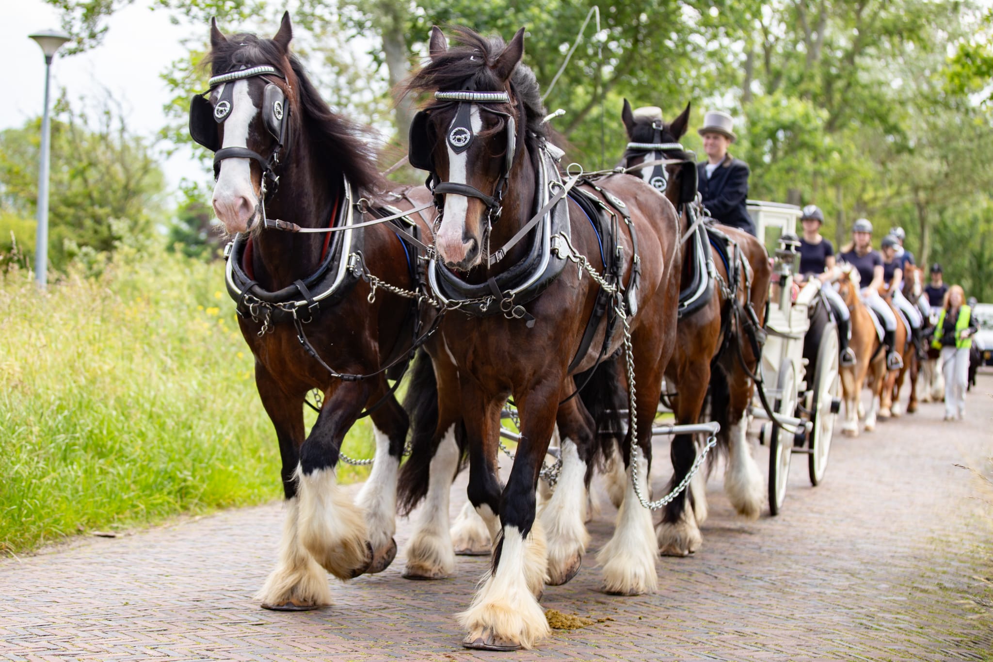 In een lange stoet van 24 paarden brachten wij het bruidspaar in de witte koets getrokken door vier Shires, van Heemskerk naar Bakkum. Een hele mooie rit.